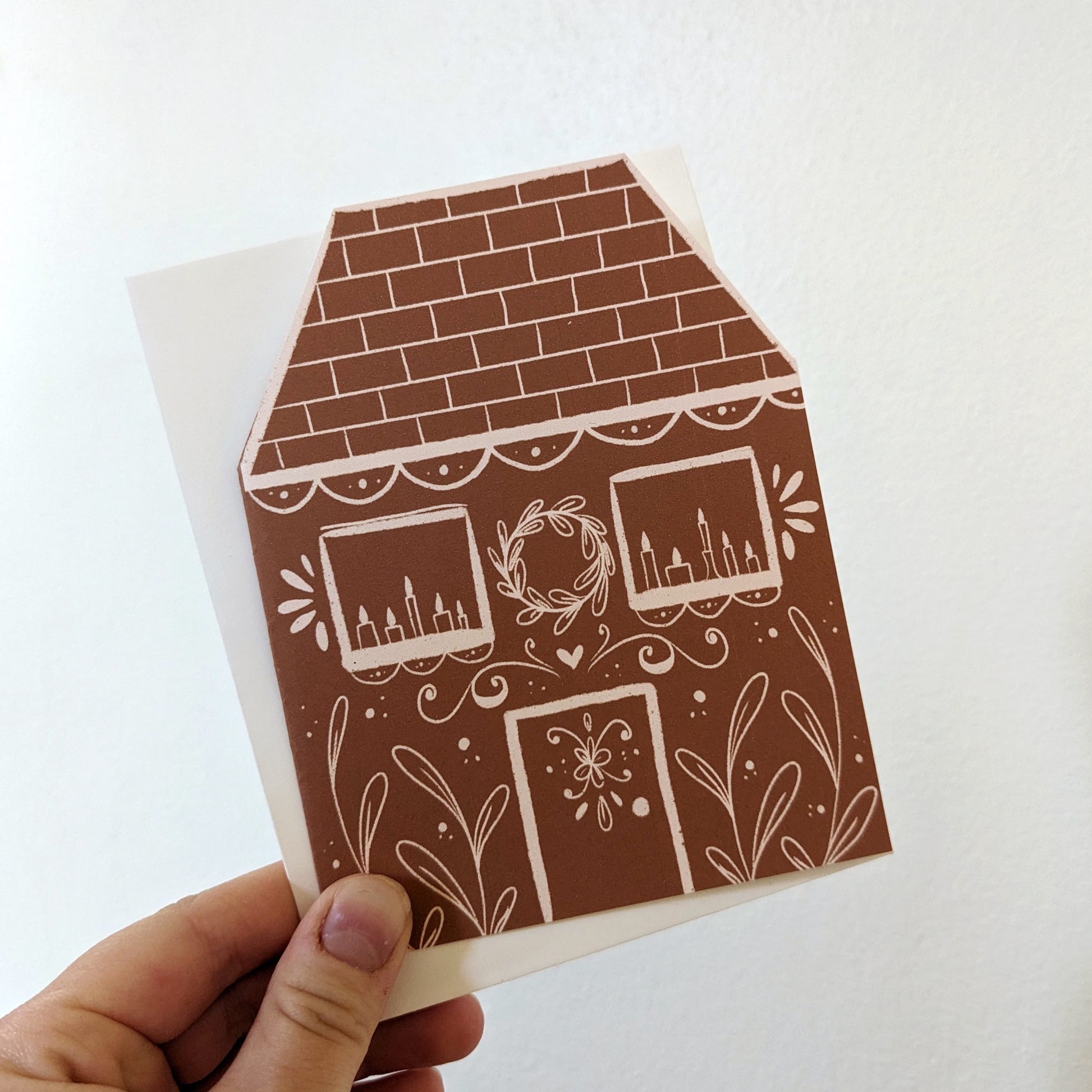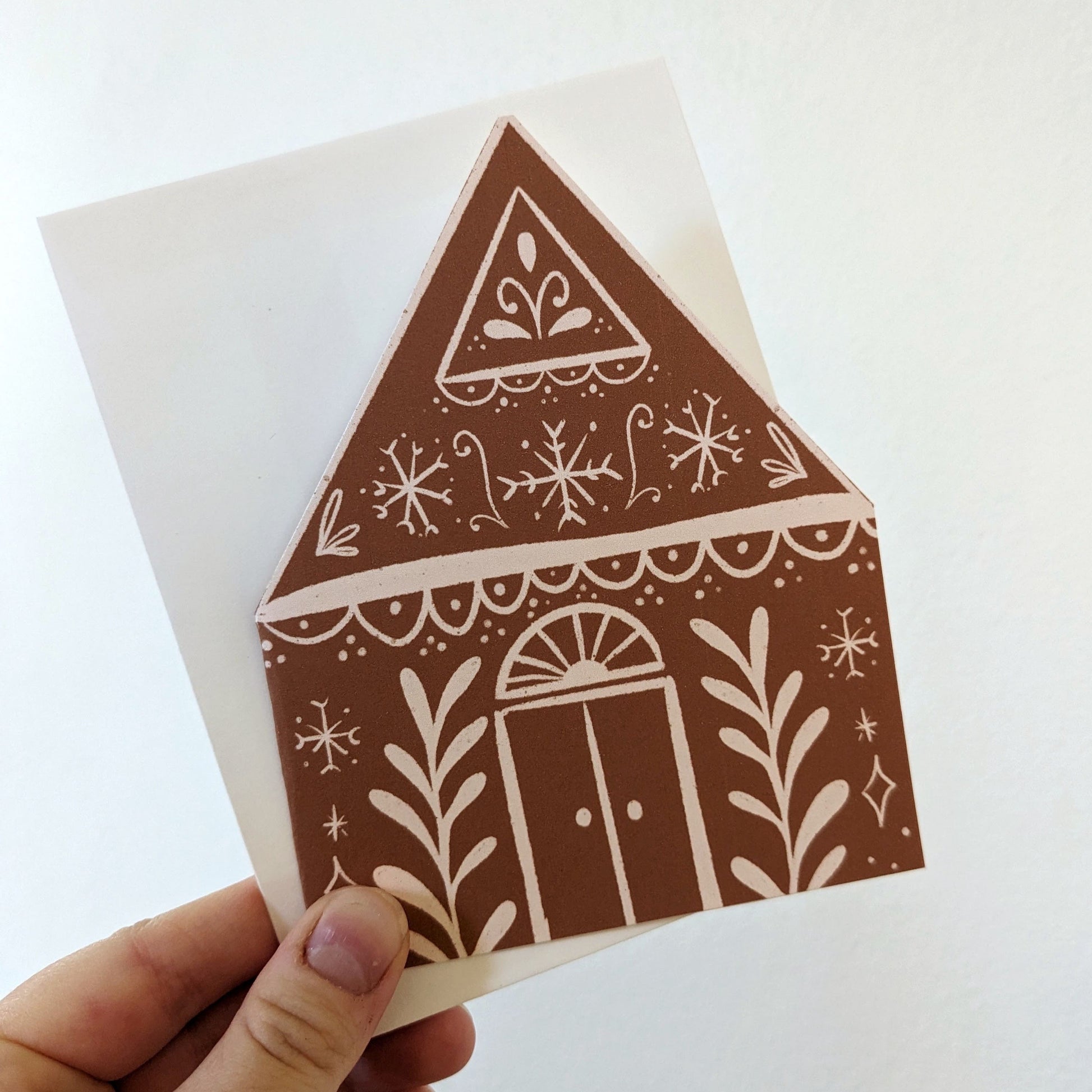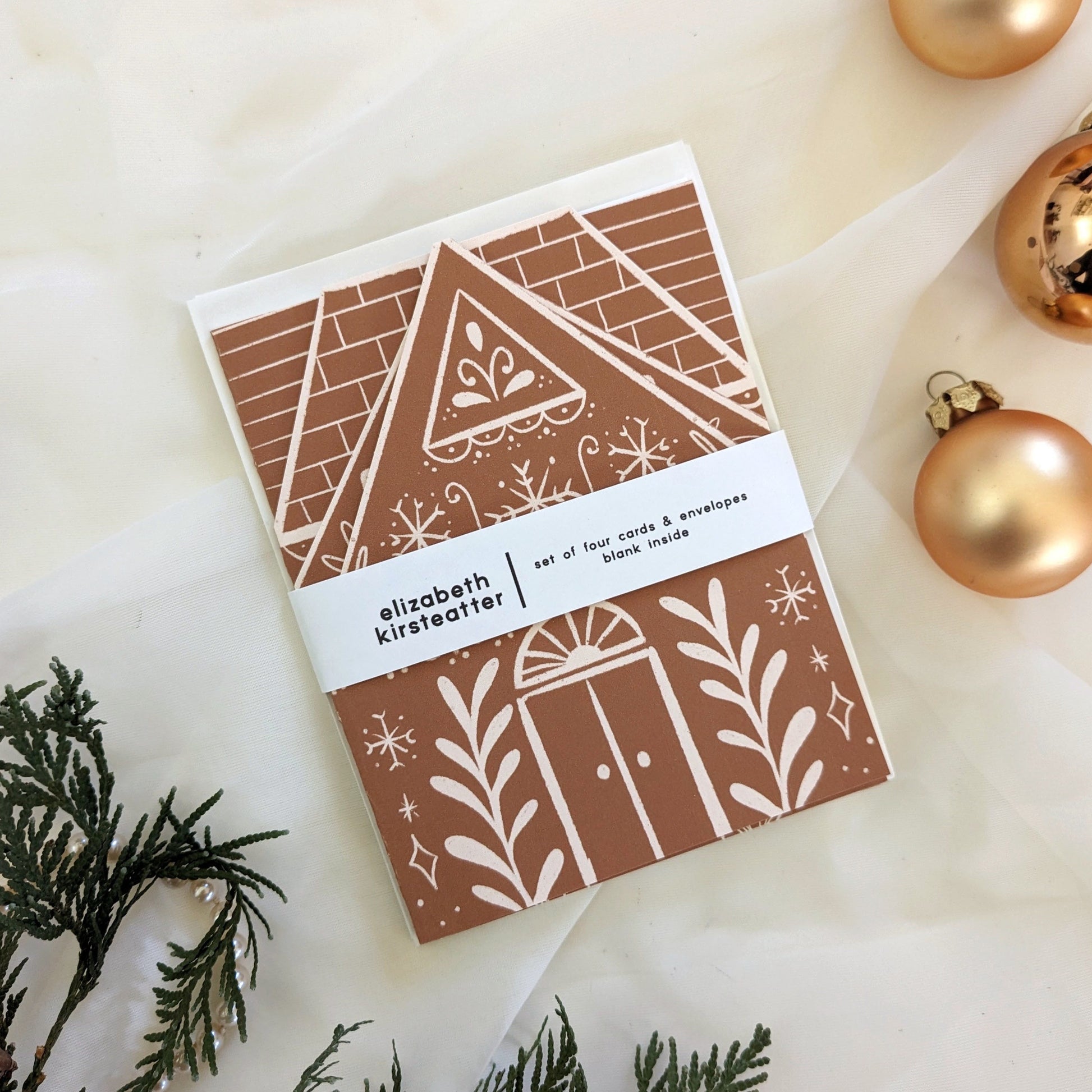 Four different adorable gingerbread houses. Die cut greeting cards shaped like cute gingerbread houses.