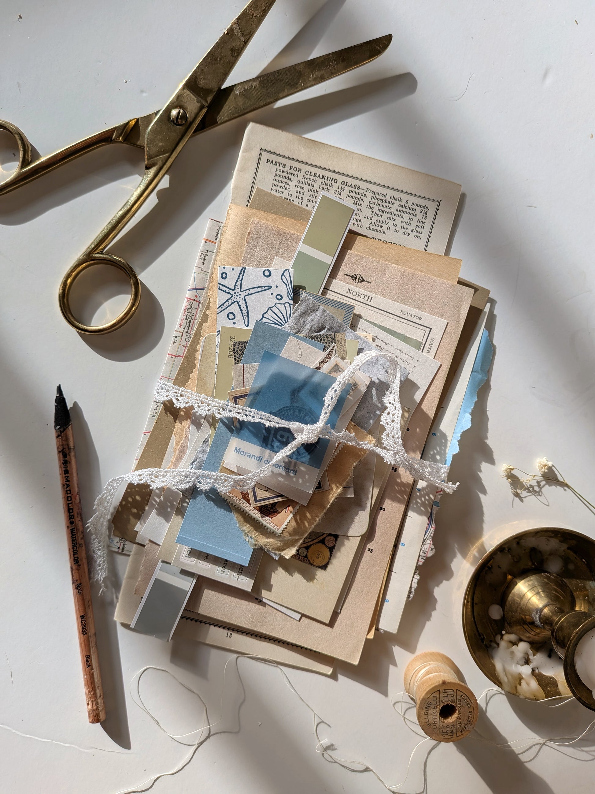 This ephemera bundle was inspired by windswept voyages and faraway beaches. Featuring sandy shells with accents of blue, its perfect for your junk journal, scrapbook, or snail mail.